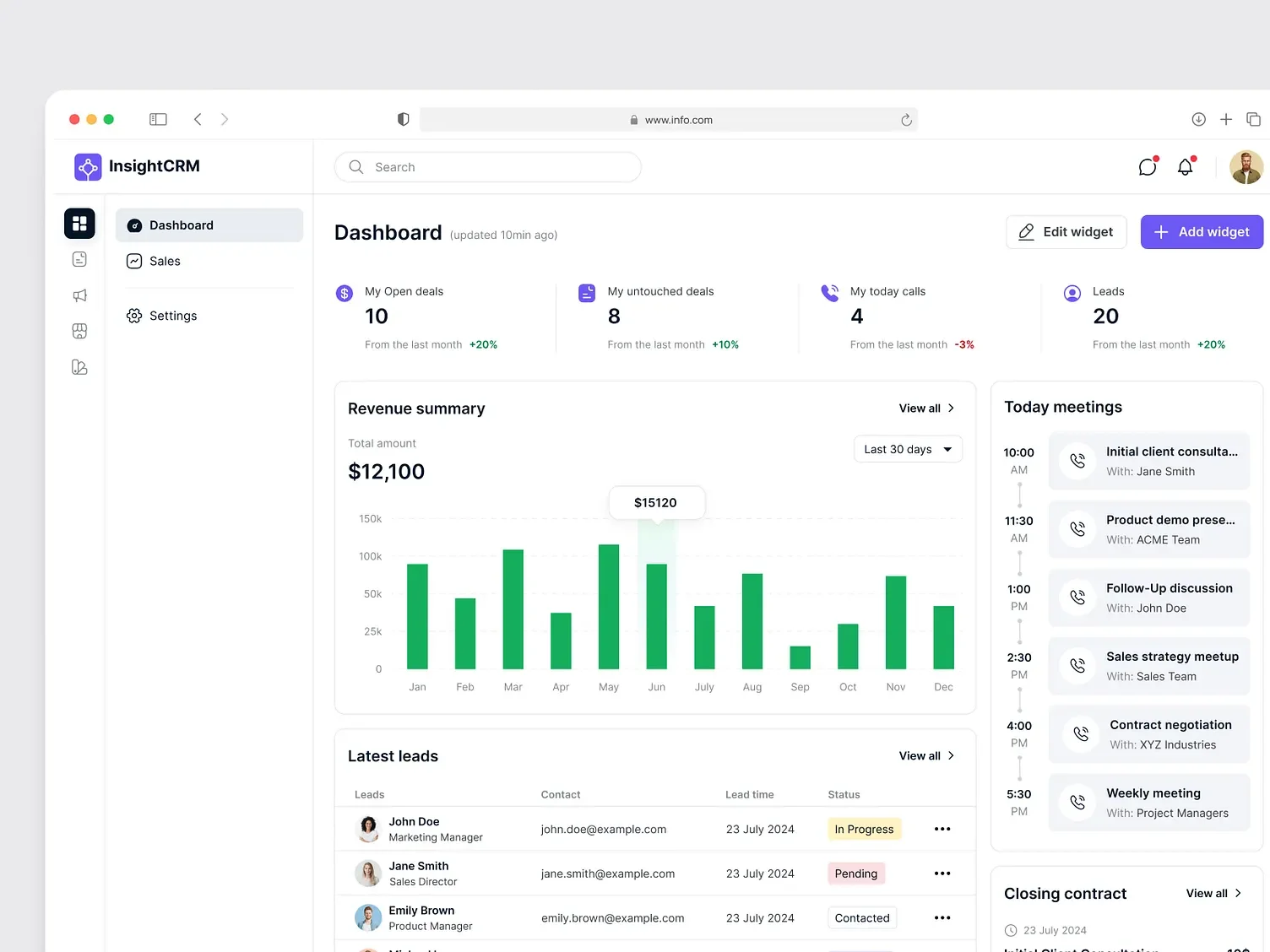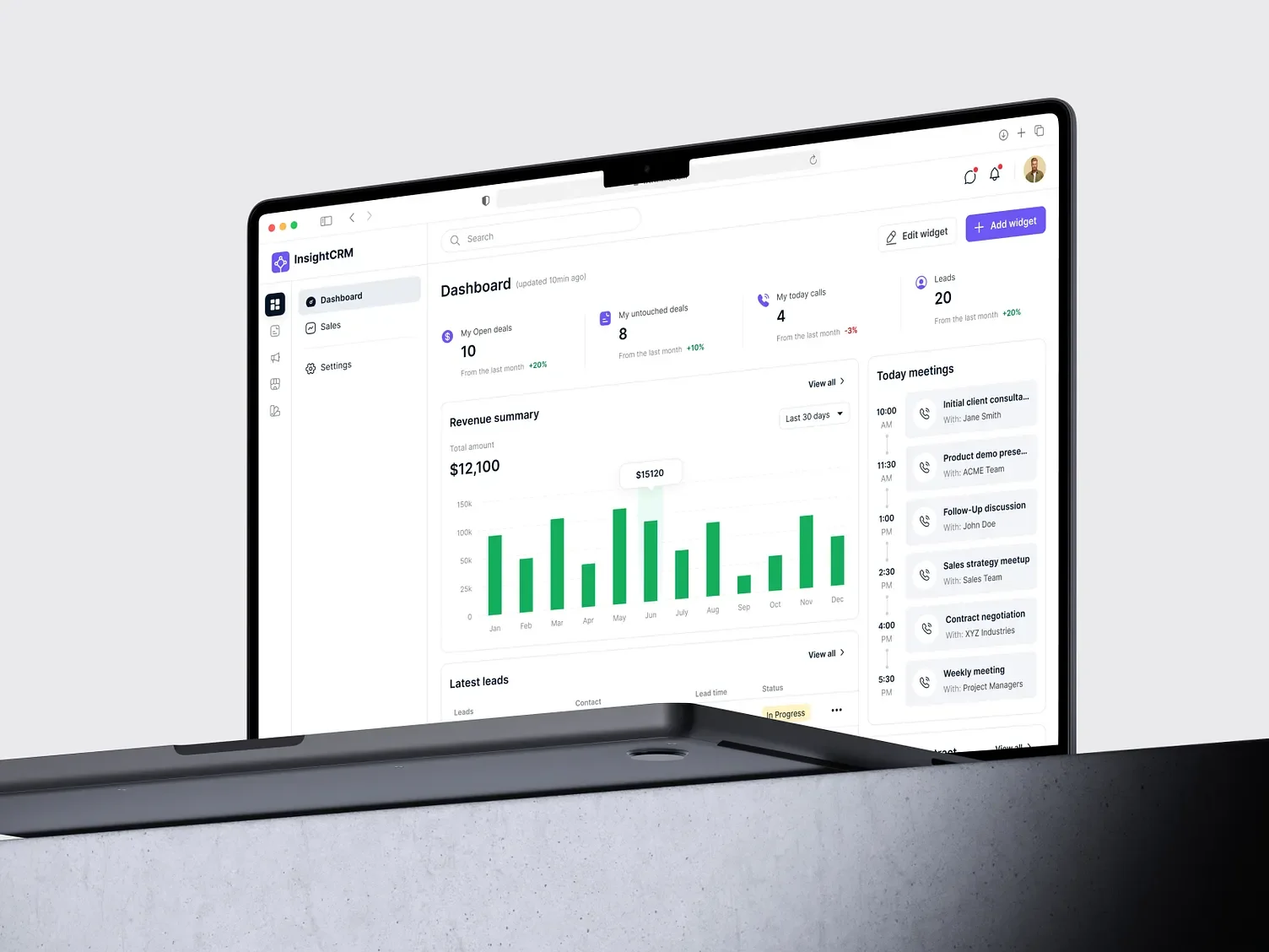 UX Workflow Improvement: The dashboard was designed for maximum efficiency, presenting actionable items alongside strategic summaries (as seen in the "Today meetings" and "Latest leads" sections) to directly drive sales team productivity.